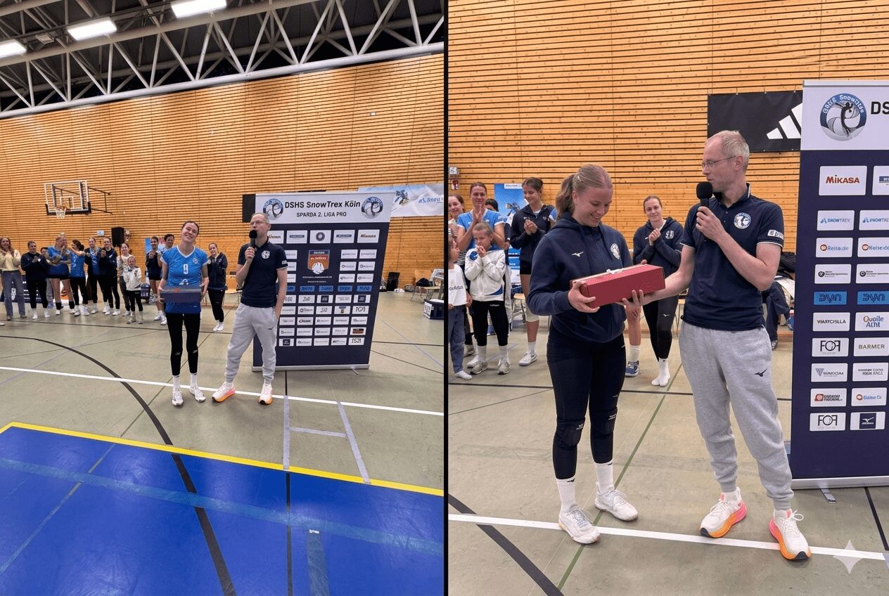 Nach dem Abpfiff war es Zeit für einen emotionalen Moment: Im Rahmen des letzten Heimspiels der Saison verabschiedete DSHS SnowTrex Köln zwei Spielerinnen aus dem Kader. Chiara Claassen und Emma Althaus wurden vor den heimischen Fans gebührend gewürdigt und verabschiedet. Beide haben ihren Teil zum Erfolg dieser Mannschaft beigetragen – auf und neben dem Feld. Der Verein dankt ihnen für ihren Einsatz im Kölner Trikot und wünscht ihnen auf ihrem weiteren Weg alles Gute.